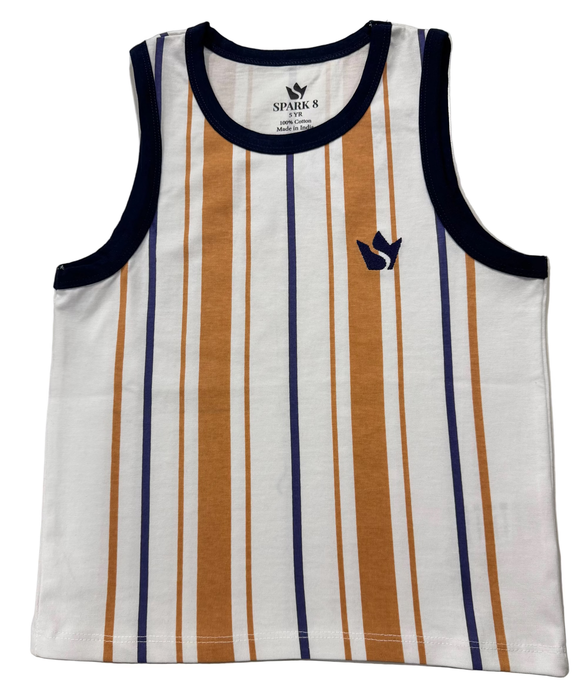 The Spark8 Boys Striped Tank is lightweight, breathable, and perfect for summer days. Designed to keep kids cool and comfortable, it features vertical stripes in warm earthy tones, a contrast neckline, and an embroidered logo detail. A versatile piece that works for play, outings, or layering, this tank is a must-have for boys aged 1–8.